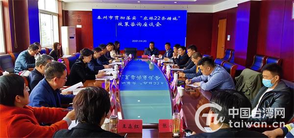 中国台湾网4月21日讯 4月20日,泰州市台办联合市农业农村局等4家部门,召开贯彻落实“农林22条措施”政策咨询座谈会。全市11家涉农台企负责人参会。