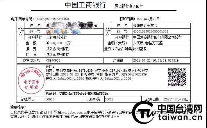 中国台湾网7月23日讯 一方有难,八方支援。河南暴雨洪水灾情牵动着嘉兴台胞的心,近日,第一笔救灾资金30万元已经驰援郑州。
