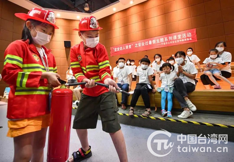 来自台湾南投县的何承恩小朋友(前右)在学习干粉灭火器使用方法(图片来源:宁波市台办)