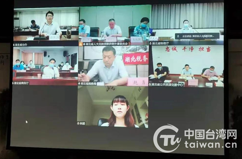 湖北省财政厅、省商务厅、省税务局、省公共资源交易中心领导及相关处室负责人等参加视频会。(中国台湾网、湖北省台办联合报道)