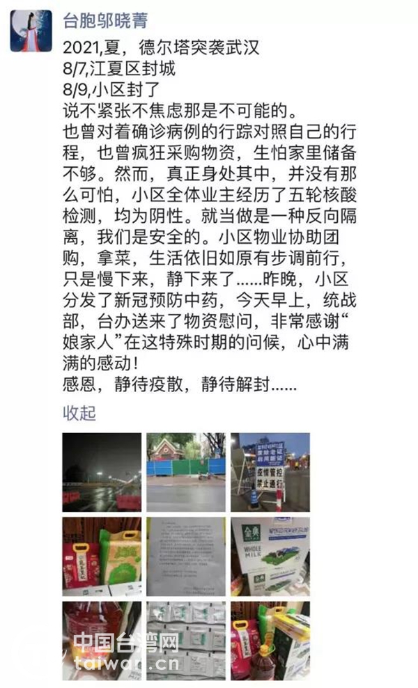 中国台湾网8月23日讯 “今天早上,台办送来了物资慰问,非常感谢‘娘家人’在这特殊时期的问候,心中满满的感动!”日前,因为疫情,台胞邬女士居住在武汉市藏龙岛的小区被列为“封闭管理小区”。在收到市、区台办慰问物资后,邬女士将自己感激的心情分享在了“朋友圈”里。