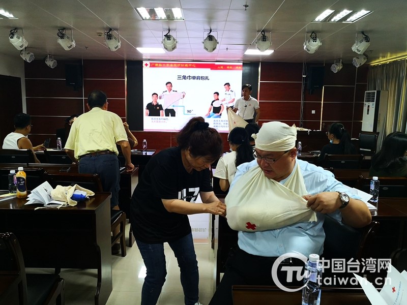 中国台湾网9月1日讯 这边在做心肺复苏,那边在进行止血、包扎、固定、搬运……日前,由广西南宁市台办主办,南宁市红十字会、南宁市台协协办的南宁市关爱台商台胞系列活动之急救医疗培训在南宁市红十字会备灾救灾服务中心会议室举办,在邕台胞台商代表30人参加。
