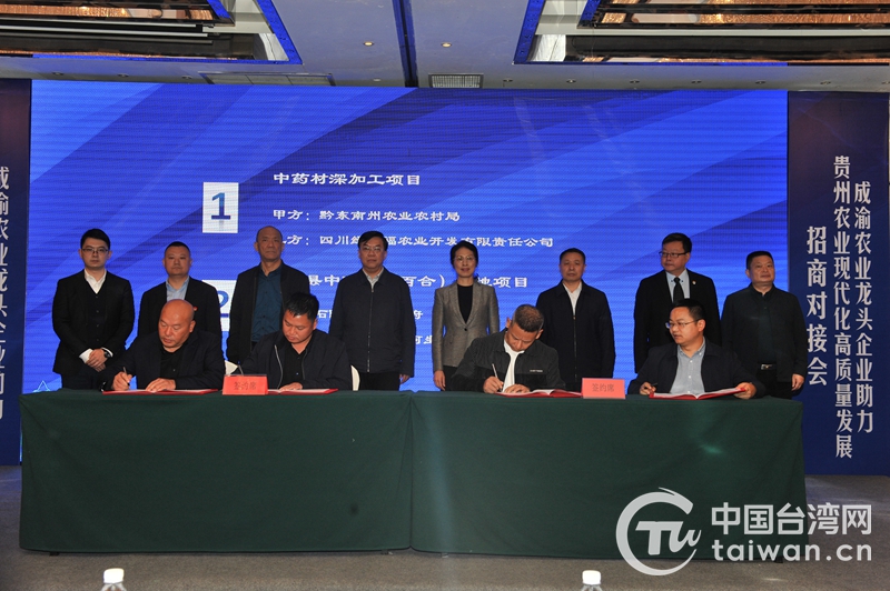 中国台湾网10月26日讯 近日,由贵州省农业农村厅、贵州省投资促进局、贵州省政府台湾事务办公室共同主办,遵义市农业农村局、铜仁市农业农村局、六盘水市农业农村局、黔东南州农业农村局、四川省农业龙头企业协会协办的“成渝农业龙头企业助力贵州农业现代化高质量发展招商对接会”在四川成都成功举行。川渝黔多家企业就中药材、食用菌、金银花等精深加工和农业基地建设项目现场签约,涉及投资金额3亿元。