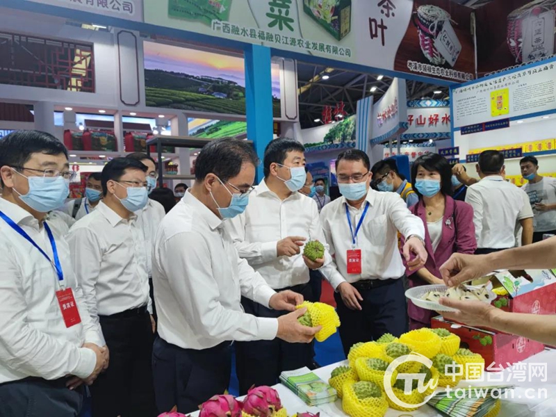 广西壮族自治区副主席方春明(左四)、广东省委常委叶贞琴(左三)到桂台农业精品展巡展,广西台办副主任林承格(左五)作介绍。(图片来源:广西台办)
