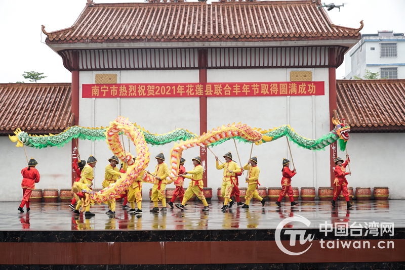 中国台湾网11月25日讯 日前,台湾花莲县举办联合丰年节,广西南宁市在宾阳县炮龙广场设分会场,将宾阳舞龙、游彩架等壮乡少数民族民俗表演以“云上”方式送到花莲县,祝福花莲县联合丰年节取得圆满成功。