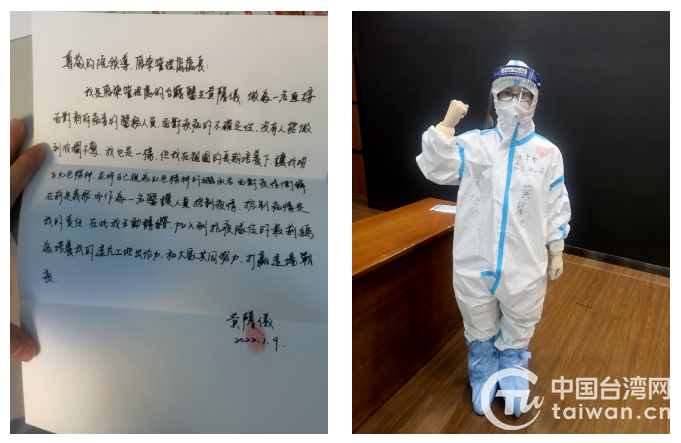 中国台湾网1月14日讯 “在此我主动请缨,加入到抗疫队伍的最前线,为培养我的这片土地出份力……”此次奥密克戎疫情袭来,天津第三中心医院台湾籍医生黄馨仪第一时间手写《请战书》递交医院,主动申请进“红区”,参与患者医疗救治工作。那鲜红的指印,正如她那颗抗击疫情义无反顾的心。