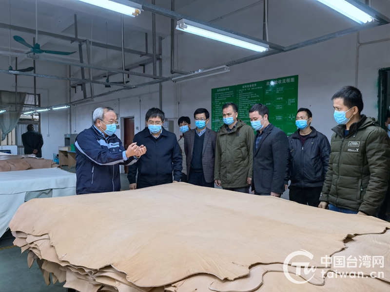 玉林市委副书记刘鹏飞(左二)走访慰问广西宝悦皮具有限公司。(图片来源:广西玉林市台办)