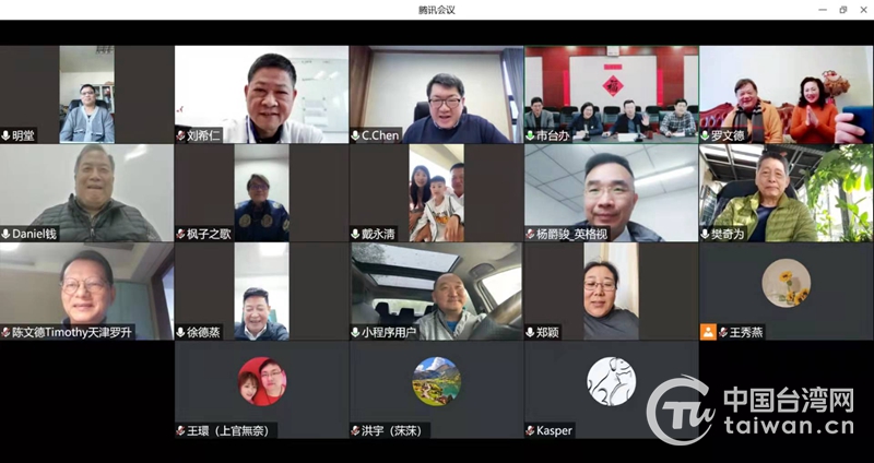 天津市台办负责同志先后连线了市台企协会会长、南侨食品集团董事长陈正文,市台企协会荣誉会长、天津凯华房地产开发有限公司董事长丁鲲华,市台企协会荣誉会长、大成食品集团董事长韩家宸,市台企协会荣誉会长、百里富工业公司董事长罗文德,市台企协会监事长、天津胜达壹零壹文创市场管理有限公司董事长戴永清等台商代表,与他们亲切交谈、回首过往、展望新年、共迎新春。