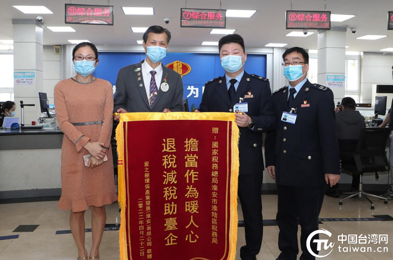 中国台湾网4月25日讯 22日下午,淮安市淮阴区税务局税政大厅迎来了两位特别的客人,台企爱之澍环保产业发展(淮安)有限公司董事长叶晋宏夫妇来到这里为税政大厅的工作人员送来一面印有“担当作为暖人心 退税减税助台企”的锦旗。表达对小微企业增值税留抵退税政策的欢迎,以及对淮阴区高效落实惠企政策、助力台企发展的感激之情。