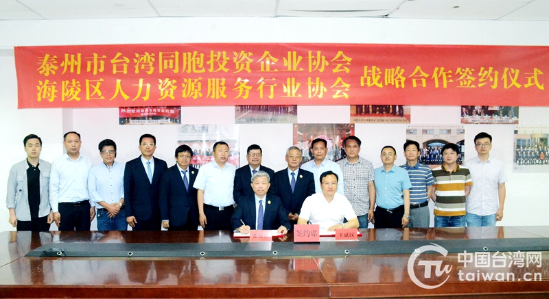 中国台湾网6月8日讯 近日,在泰州市台办的牵线搭桥下,泰州市台协与海陵区人力资源服务行业协会举办战略合作协会签约仪式。明确两会建立全方位、多角度、深层次的战略合作关系,实现信息与服务双向沟通,及时、精准、高效地为有需求的台企“量身定制”人力资源服务方案。