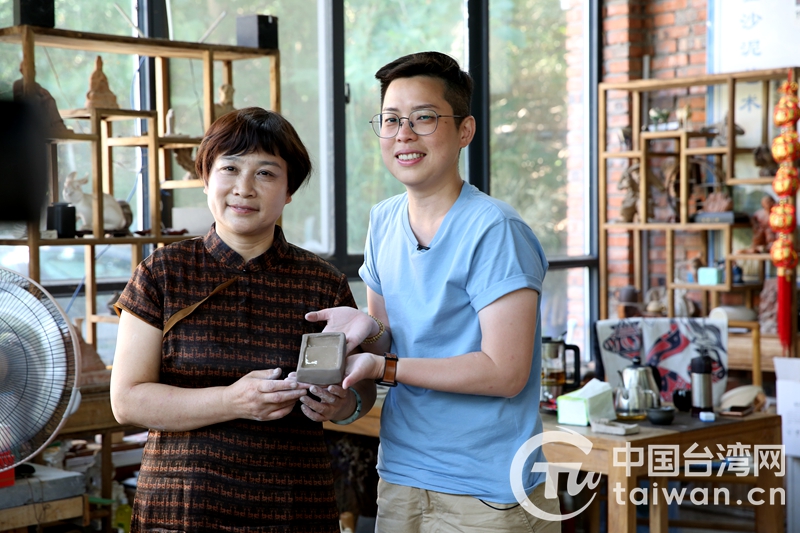 黄恺嘉制作黄河澄泥砚后与王玲老师合影(图片来源:河南省台办)