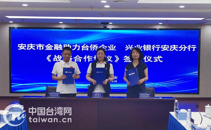 中国台湾网7月18日讯 日前,安庆市台办、安庆市台协会、兴业银行安庆分行举行战略合作协议签约仪式。根据三方合作协议,兴业银行将为安庆台资企业提供“台商兴业贷”“台商创业贷”等专属金融产品,同时提供全方位综合金融服务方案,提升台胞在大陆工作、生活的便捷性,满足在宜台资企业的多重金融需求。