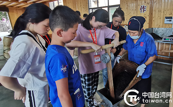 两岸青少年体验制作手筑伏砖茶过程。(中国台湾网发)