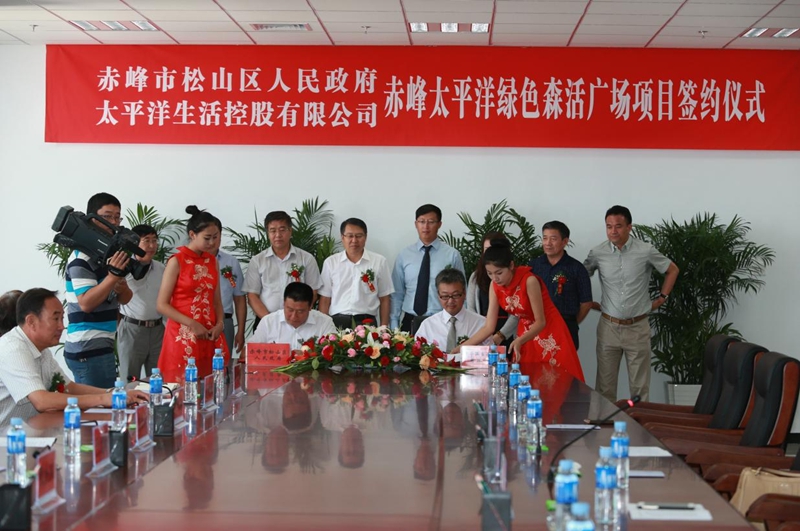 2015年赤峰市松山区政府区长田向存与太平洋生活控股有限公司大陆投资事业处总裁梁晓暄代表双方签约。(图片来源:赤峰市台办)
