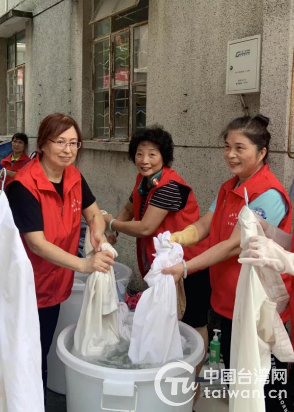 台湾同胞赖丽卿和队员们清洗学校演出服装(图片来源:珠海市委台港澳办)