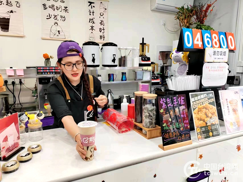 中国台湾网3月21日讯 在国家级海峡两岸青年就业创业基地——亚台青(成都)海峡青年创业园一楼临街铺面,有一家名为“紫气茶来”的奶茶店,店主是一位来自台湾的90后女孩——陈韵如。