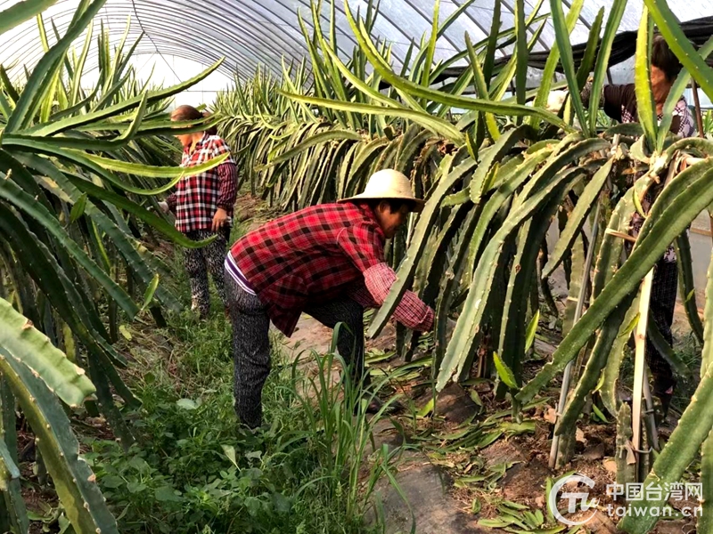 这里是台资农企四川广绿农业科技有限公司的红心火龙果大棚基地,自入春以来,广绿农业的火龙果大棚里,早已呈现一片热闹的春耕备耕场景,每天30多名工人细心地为果树修枝、除草、培土、施肥,栽种培育新的火龙果苗。