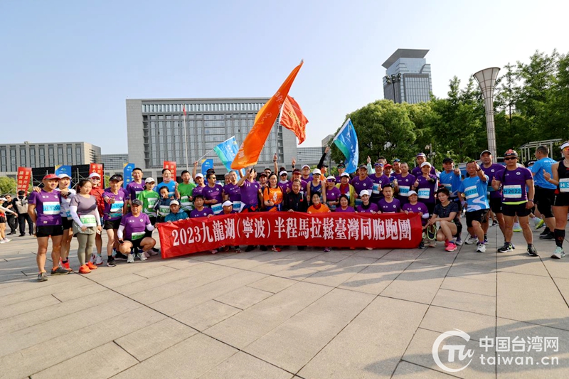 中国台湾网4月25日讯 近日,2023九龙湖(宁波)半程马拉松赛鸣枪开跑,来自台湾南投县和宁波镇海区的50位跑友分别穿着的橘色队服和紫色队服,形成了一道靓丽的风景线。