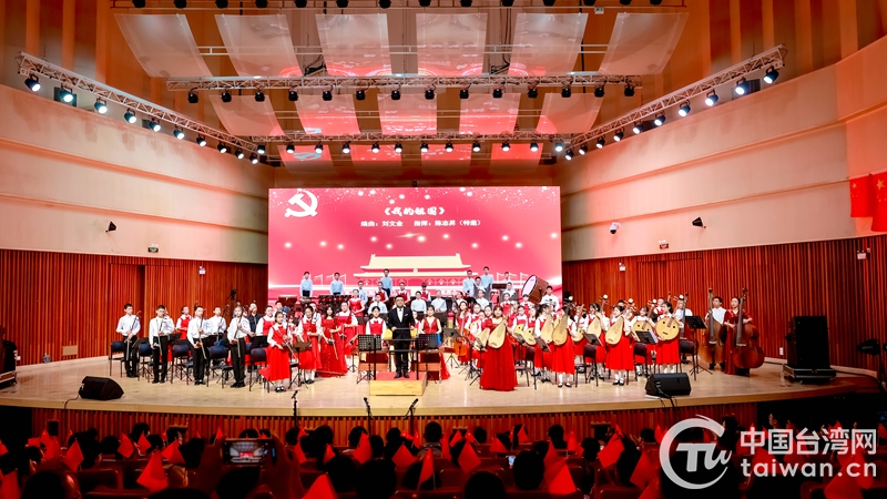 中国台湾网7月13日讯 仲夏午后,五缘音乐厅里,当特邀台湾著名民乐指挥陈志昇手中的指挥棒挥起,蔡塘学校追光民乐团奏响《我的祖国》激昂旋律,现场的海峡两岸同胞挥舞着手中的五星红旗,齐声歌唱,在这个夏日里共同抒发心中那份炽热的爱。