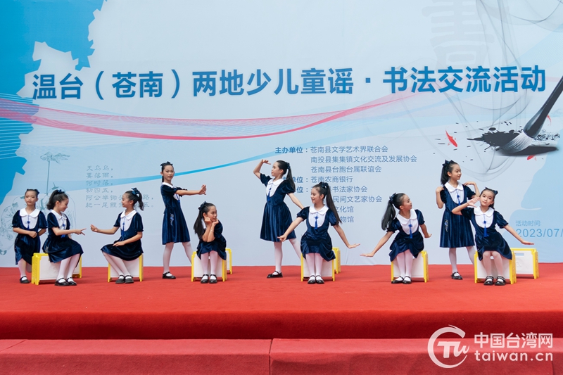 中国台湾网7月28日讯 近日,温台(苍南)两地少儿童谣·书法交流活动在浙江苍南举行。两地近100名少年儿童共聚苍南,以中华传统艺术为桥梁,泼墨挥毫,共叙两岸情。其中来自台湾南投县老师、学生以及家长代表共39名。