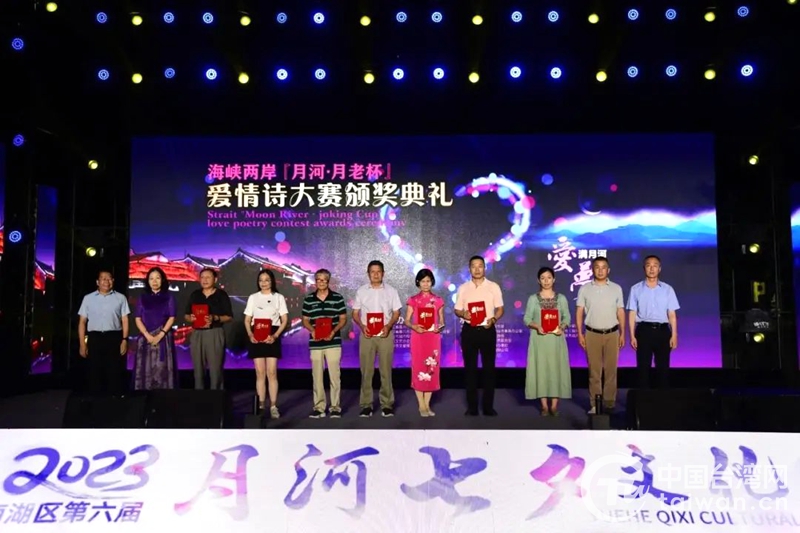 中国台湾网8月23日讯 近日,2023海峡两岸“月河·月老杯”爱情诗大赛在浙江嘉兴举办颁奖典礼。组委会邀请著名诗人和著名评论家,对入围的优秀作品进行隐名评比,共评出金奖1件,银奖5件,铜奖8件,优秀奖20件。