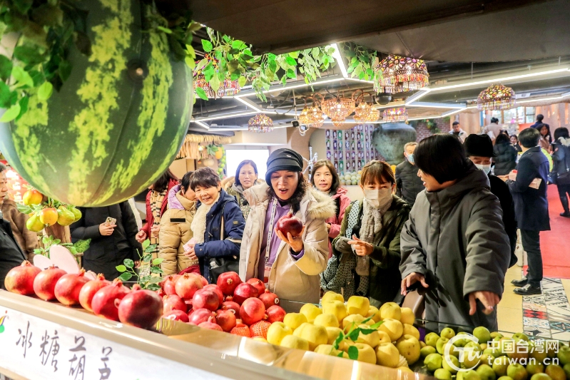 台湾商业总会女企业家参访团在大巴扎景区水果巴扎参观(新疆台办供图)