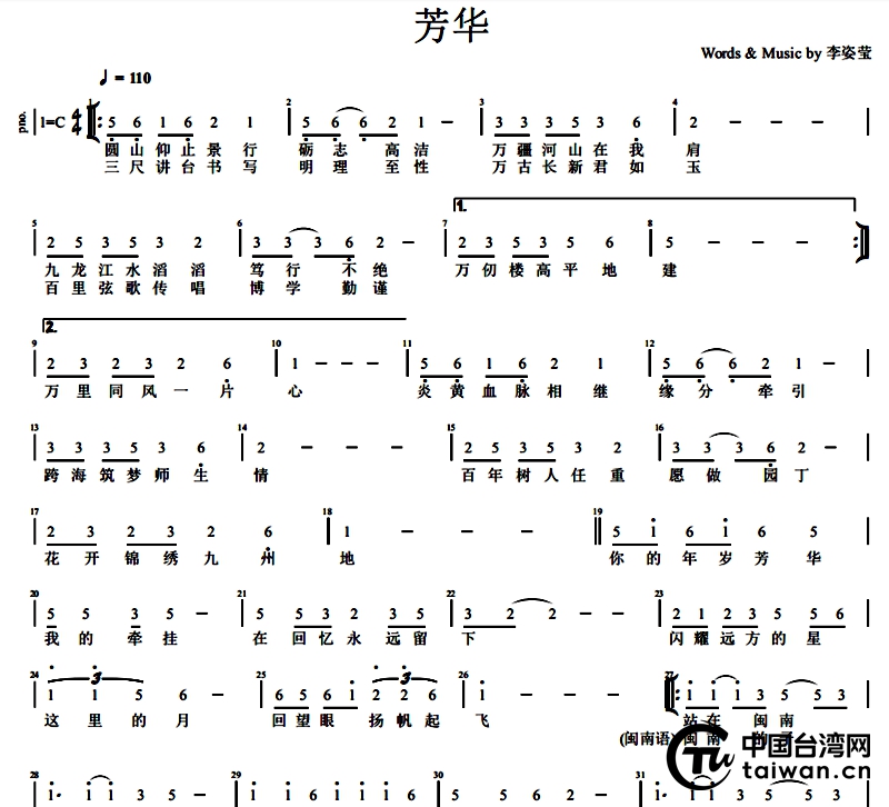 中国台湾网1月2日讯 近日,由闽南师范大学文学院副教授、台湾教师李姿莹作词谱曲,香港音乐人陈思文编曲,闽南师范大学两岸师生共唱的歌曲《芳华》重磅发布。