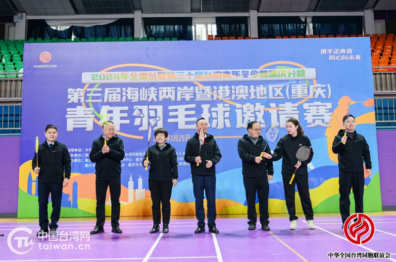 中国台湾网1月25日讯 全国台联第三十届台胞青年冬令营重庆分营暨第三届海峡两岸及港澳地区(重庆)青年羽毛球邀请赛今日在大渡口区体育馆隆重举行,来自台湾、香港、澳门地区及重庆的58名青年羽毛球选手参赛。
