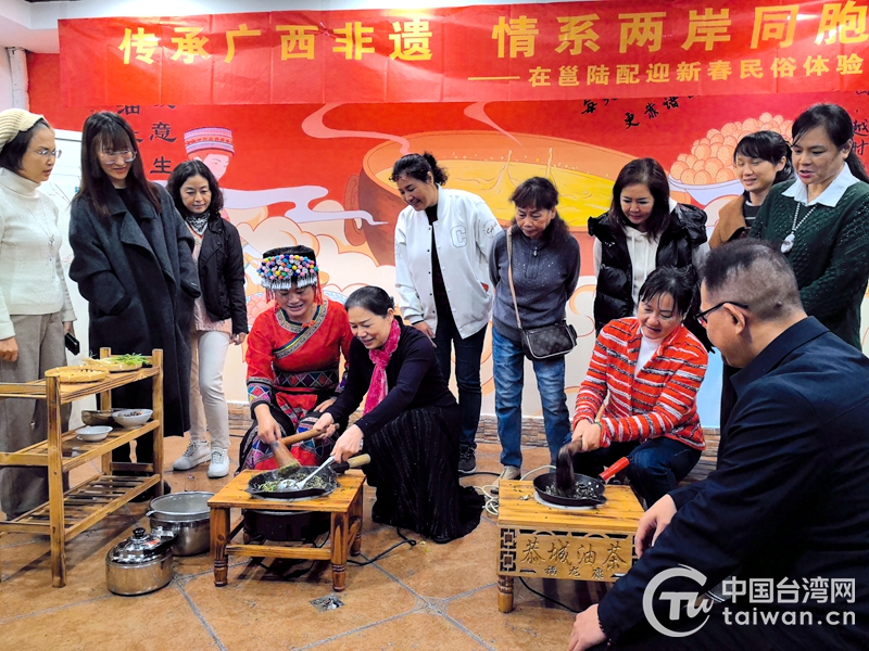2月4日,广西南宁市台办组织台胞和陆配代表开展“传承广西非遗 情系两岸同胞”在邕陆配迎新春民俗体验活动,打油茶、品非遗,送温暖、话融合。