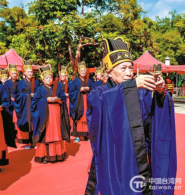 鼓初严、鼓再严、鼓三严。伴随着雄浑深沉的鼓声响起,主祭官浴手、迎神、宣读祭文,带领两岸民众代表庄重地进行三献礼等流程,完成了一场庄严肃穆的尊古颂典仪式。