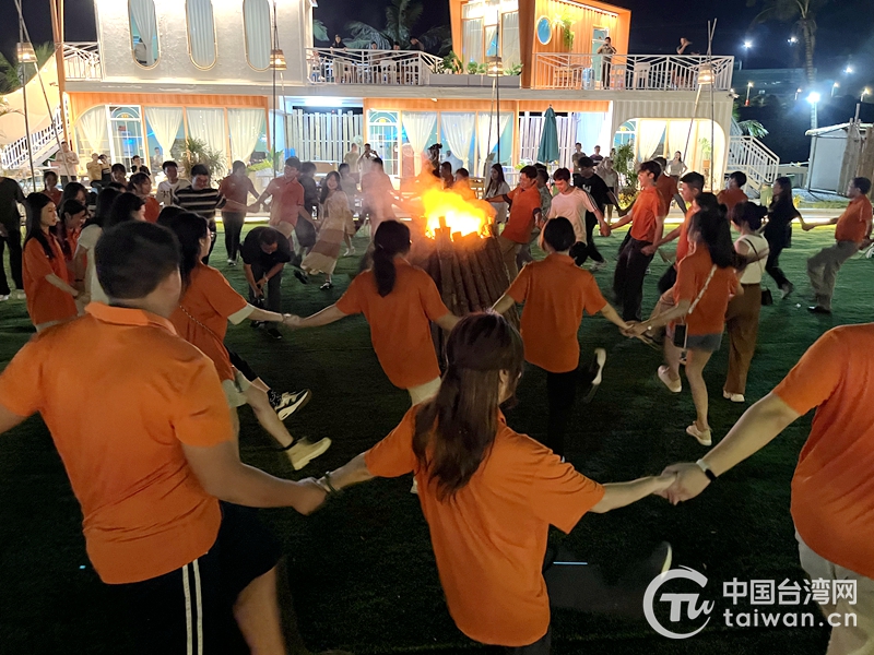 清风徐来,水波不兴,美丽的金町湾,篝火点起来了。台湾青年岭南行潮汕文化寻根营活动在两岸青年手拉手,翩翩起舞中拉开序幕。汕尾的青年朋友为这场篝火晚会早早做足准备,扮靓沙滩营地,挑选汕尾特色美食,彩排文艺节目。动感的音乐唱起来,欢快舞蹈跳起来;支援前线、喊数抱团等互动小游戏,将活动气氛一次次推向高潮;新鲜的啤酒、美美的海鲜,说不完的话题,讲不完的故事,夜幕与篝火交织、青春与激情相伴,两岸青年尽情体验这场专属的盛夏狂欢。第一次来汕尾的台湾大学生黄同学开心地说:“我们从学习课程、社团活动、研学旅游到流行歌曲、民俗文化,都有聊不完的话题,还互相加了微信,初次见面就像见到多年未曾谋面的表兄弟、表姐妹一样。”
