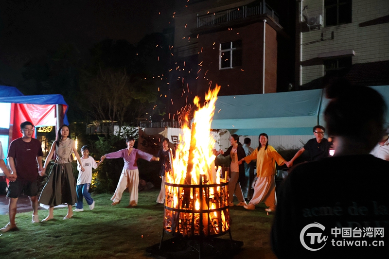 随着夜幕徐徐落下,与会嘉宾在户外草坪燃起篝火,杭台青年手拉手形成一个同心圆,寓意团团圆圆。两地青年代表围坐一起共赏明月,共品月饼、柚子、烤肉等美食,畅谈西湖和台湾的风土人情故事。篝火映红了脸颊,欢快的歌声、爽朗的笑声若清波荡漾久久不息。在轻松的氛围中,两地青年彼此间的心理距离不断被拉近。