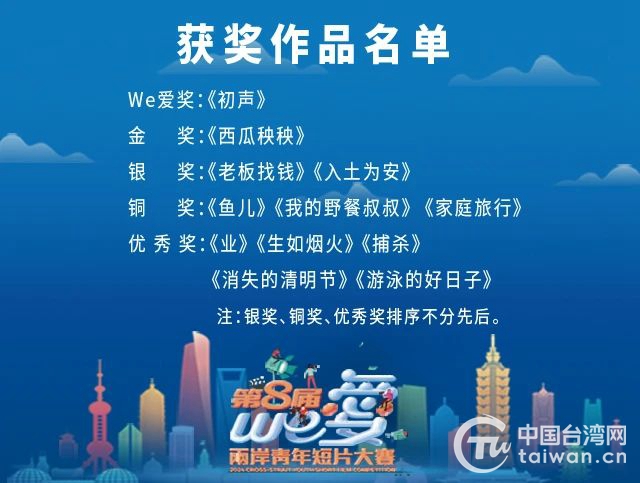 据悉,We爱两岸青年短片大赛自2017年举办以来,已累计吸引近10万名两岸青年创作者参与活动,累计征集到来自大陆和台湾地区的作品17935部,活动平台孕育了众多精彩的电影短片,培养了一大批优秀的两岸青年影视工作者。其中第六届银奖作品《倒春寒》,继在we爱之后,又相继获得第六届平遥国际电影展“平遥一角公开组评审荣誉奖”、第十二届中国高等院校学会奖“剧情短片学生组一等奖”、亚洲微电影艺术类“青春力量单元好作品奖”等。第七届We爱奖作品《长河》,被推荐入围第7届平遥国际电影展、入围12届新加坡华语电影节、入围第27届洛杉矶国际短片电影节等。大赛更通过台北市影音公会带台湾地区青年导演前进4个海外影展,邀请63部作品参加光州国际文化创意产业展,9部作品参加戛纳国际影视节展,5部作品参加东京国际电视节展,向国际电影界展现了两岸青年导演交流合作的丰硕成果。
