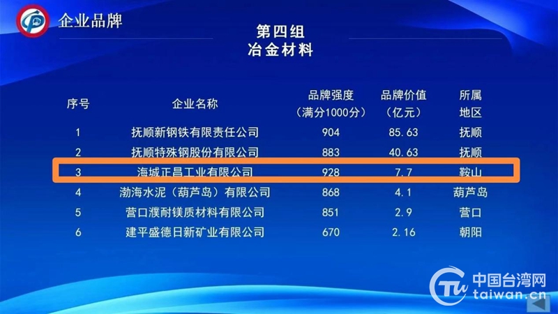 海城正昌工业有限公司位列冶金材料榜单第三名(鞍山市台办供图)