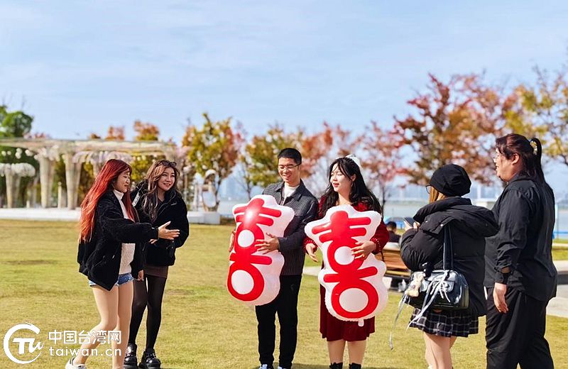 台湾青年为刚登记的年轻夫妻送上祝福。(中国台湾网发)