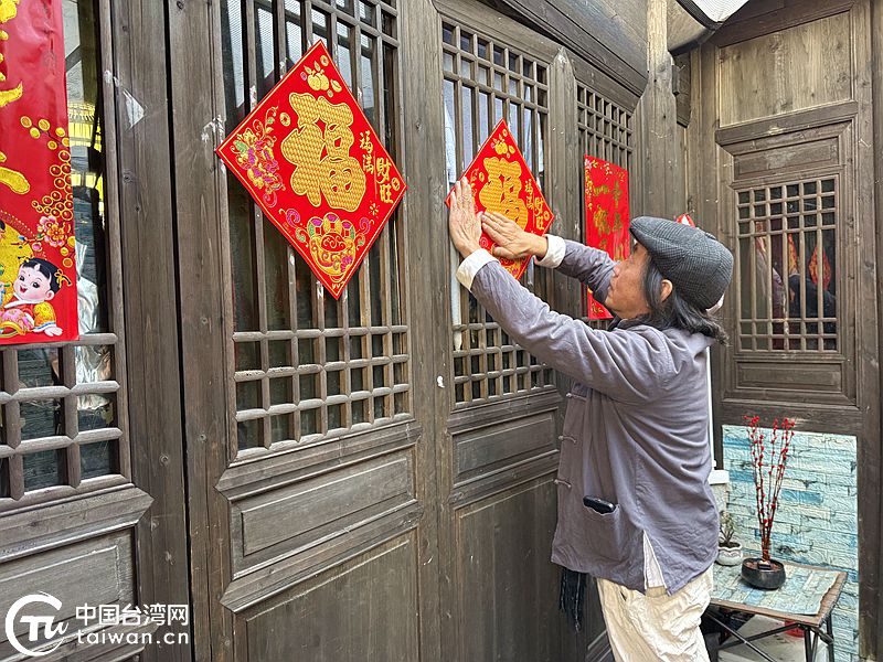 吴秉益用红‘福’字 、对联把家里好好打扮一番。(中国台湾网发)