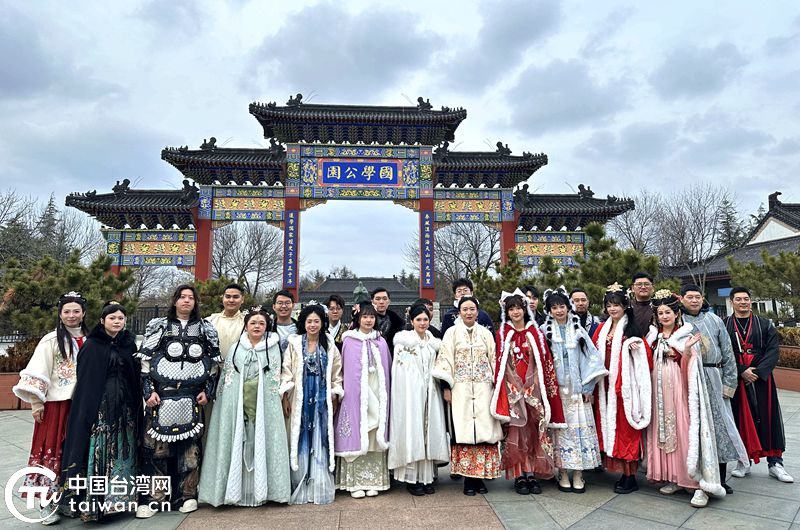 台湾青年穿汉服打卡青岛城阳国学公园。(中国台湾网发)