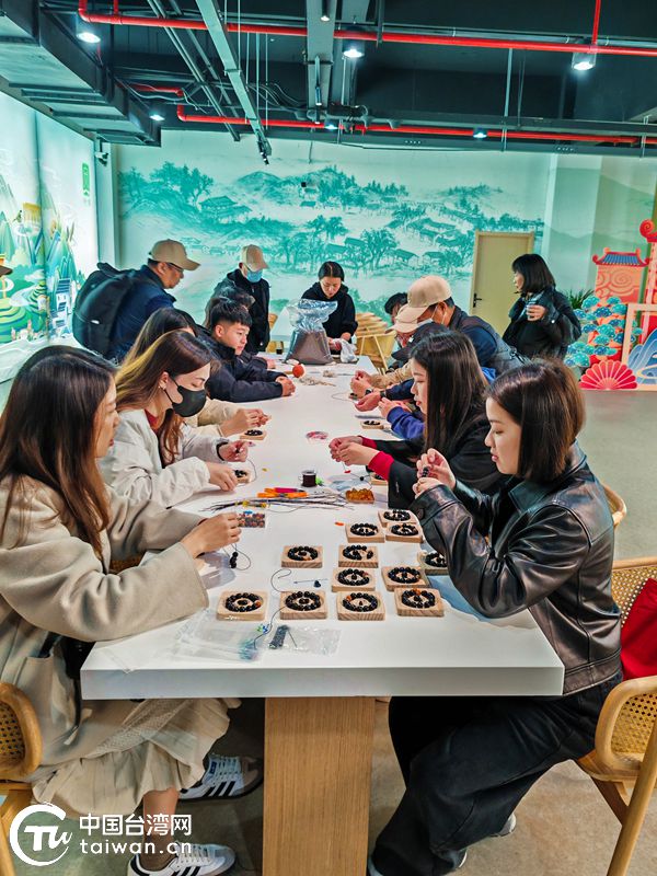 旅台乡亲体验制作“决明子”养生锤、“五患子”手串。(中国台湾网发)