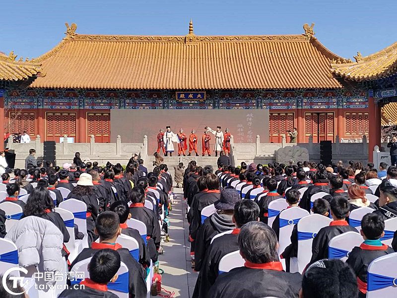 大成殿前,来自台北、高雄、桃园、嘉义、南投等岛内县市的台湾同胞和济南市天桥区制锦市街小学师生一起,身着汉服,手持竹简,齐声诵读《论语》经典篇章。“学而时习之,不亦说乎?”等经典名句响彻耳畔 ,琅琅书声令现场观众无不动容。参加诵读活动的台湾青年表示:“站在孔孟之乡诵读经典,感受到两岸文化血脉相连,就像泉水一样涌流不息,更体会到中华文明生生不息的力量。”
