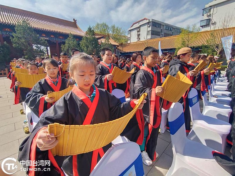 来自台北、高雄、桃园、嘉义、南投等岛内县市的台湾同胞和济南市天桥区制锦市街小学师生一起,身着汉服,手持竹简,齐声诵读《论语》经典篇章。(中国台湾网发)