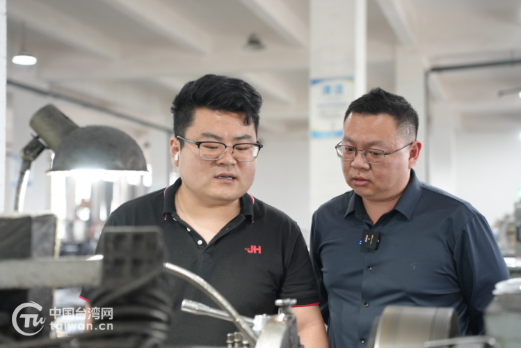在位于吉安市峡江县的吉安锦鸿精密模具配件有限公司厂房里,蔡旺哲与员工交流。(中国台湾网发)