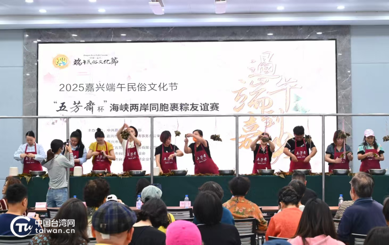 2025嘉兴端午民俗文化节“五芳斋杯”海峡两岸同胞裹粽友谊赛现场。(中国台湾网发)