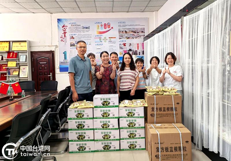 中国台湾网8月15日讯 近日,盛夏高温,威远县台办组织慰问组赴台资企业内江市井得毛织制衣有限公司,为奋战一线的企业员工送去金银花露、板蓝根、菊花等防暑物资。