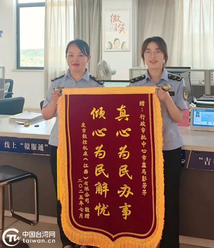 台胞将锦旗赠送到吉安市市场监管局井冈山经开区分局行政审批窗口。(中国台湾网发)