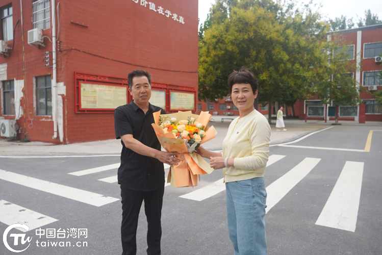 为台界教师代表送花慰问并交谈。(中国台湾网发)