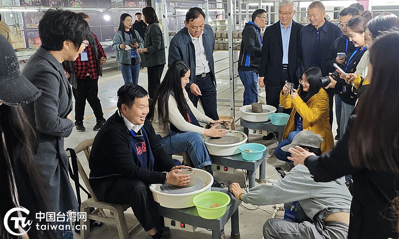 媒体记者们亲手体验汝瓷拉坯、修坯的过程。(中国台湾网发)