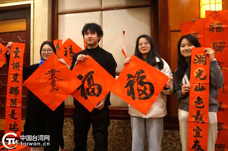 台胞们展示自己写的福字、春联。(中国台湾网发)