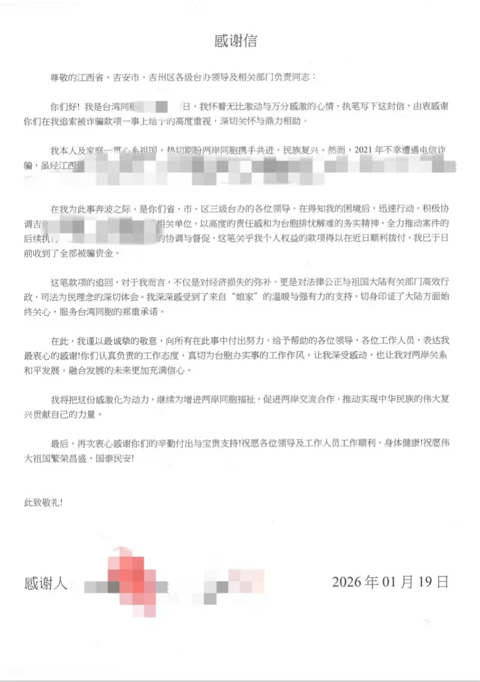 中国台湾网1月27日讯 “我深深感受到了来自‘娘家’的温暖与强有力的支持,切身印证了大陆方面始终关心、服务台湾同胞的郑重承诺。”近日,一封来自宝岛台湾的感谢信寄到了吉安市台办。台胞方先生在信中字字恳切,诉说着被诈骗钱款失而复得的激动,真切感受到祖国大陆对台胞合法权益的坚实保障。