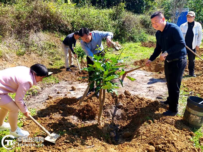梅州市台联会长易海(右一)率台胞、台属在雁洋镇南福村开展植树活动。(中国台湾网发)