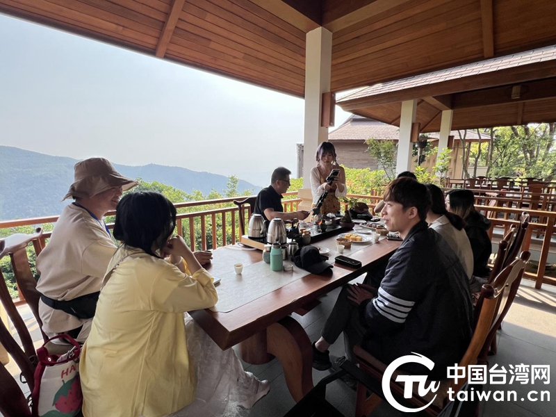 在沧源佤族自治县的荣康达茶叶基地,采访团一行逛游茶园,了解该基地及临沧茶产业的发展。这是台湾青年和自媒体博主围坐品茶、拍摄。(中国台湾网记者 刘琳 摄)